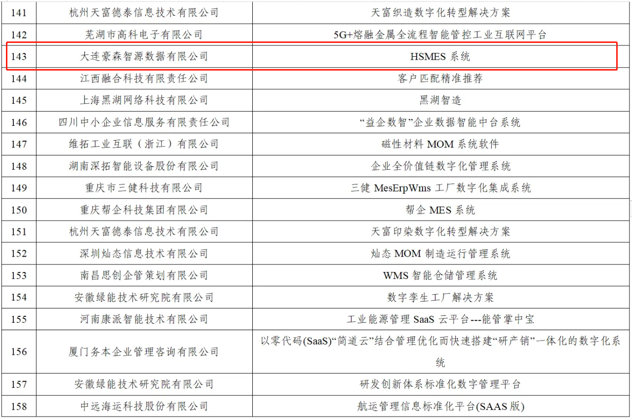 2024年2月27日,中国工业互联网研究院公布了2023年中小企业数字化转型典型产品和解决方案的通知,大连豪森智源数据有限公司自研软件HSMES系统位列其中。