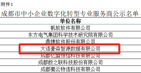 2024年3月20日,成都市经济和信息化局公布了成都市中小企业数字化转型服务商公示,大连豪森智源数据有限公司(以下简称“豪森智源”)位列其中,成功入选。