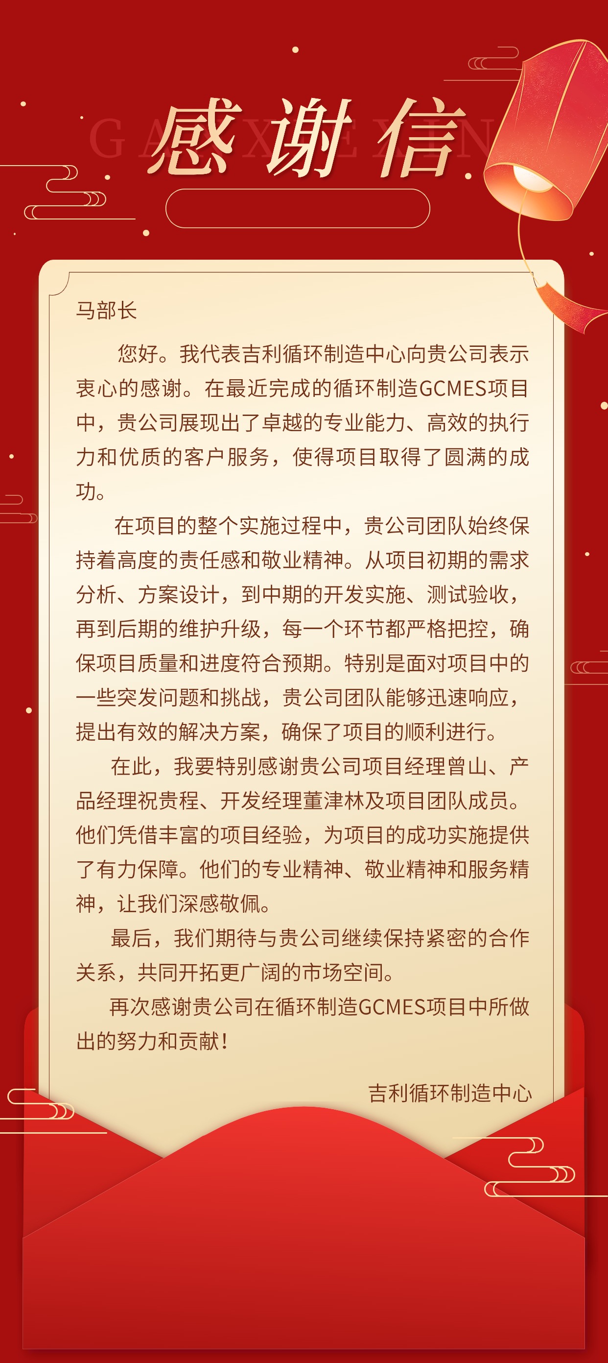 吉利循环制造中心×豪森智源!项目成功交付,智源获感谢信一封!