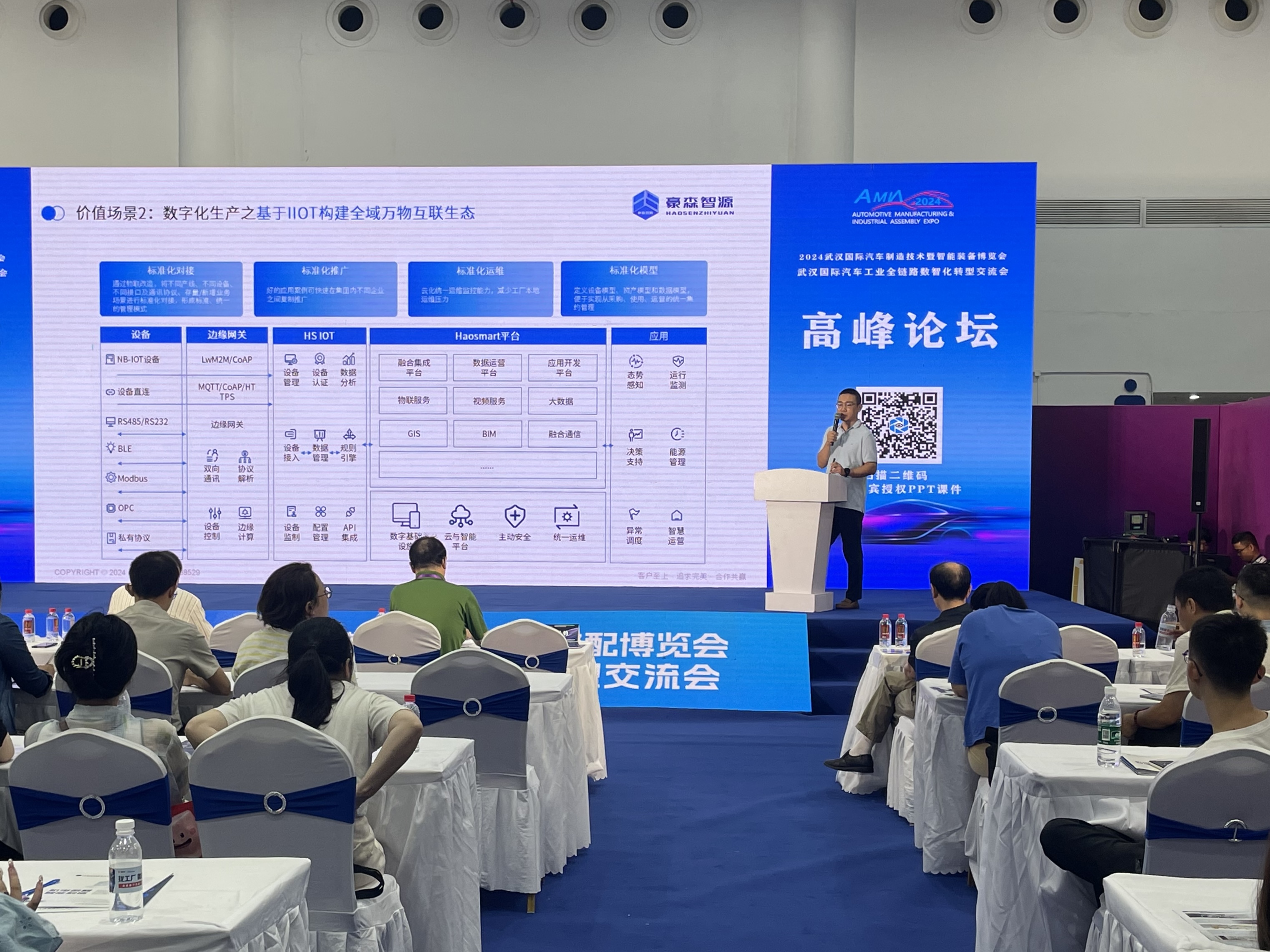 豪森智源咨询总监在博览会中发表精彩演讲,充分展示了豪森智源深耕行业20载的汽车制造底蕴经验,同时详细介绍了在智能制造领域的最新成果。通过OT-IT-DT深度融合,豪森智源能够帮助企业实现对生产过程的全方位、精细化管理。借助自主研发的大数据平台与AI算法,制造运营管理系统、生产制造执行系统、仓储物流管理系统、质量管理系统、能源管理系统、设备管理系统等一系列智能制造解决方案共同构成了一套完整、高效的智能制造生态体系。